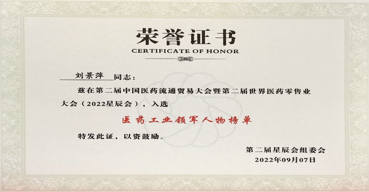 本次星辰会期间,yh86银河国际斩获颇丰,获得多项行业奖项及荣誉。在开幕式上,刘景萍董事长荣获“医药工业领军人物”称号。